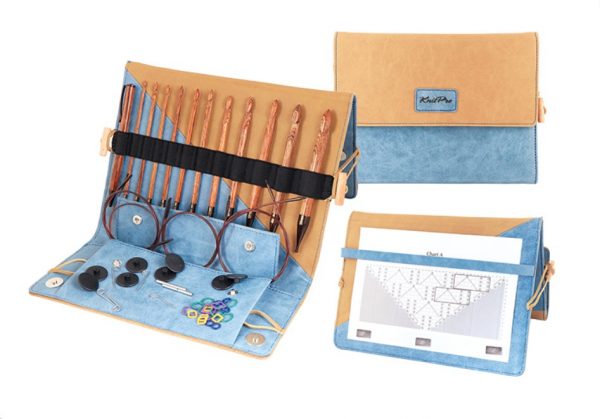 Vąšeliai ir visi priedai supakuoti į dėklą, kuris pagamintas iš aukštos kokybės džinso ir smėlio spalvos medžiagos, be to dėkle yra ir mezgimo raštų/schemų laikiklis.